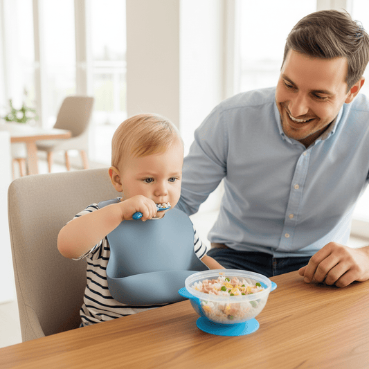 • Un enfant mange avec son couvert bébé en silicone bleu avec son papa