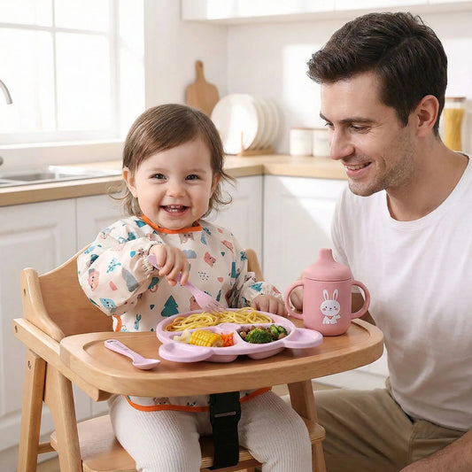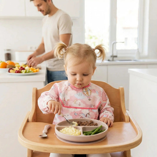 • une fillette de 18 mois prend son repas dans le set vaisselle bébé complet beige. Son père est fier de la voir se débrouiller comme une grande.