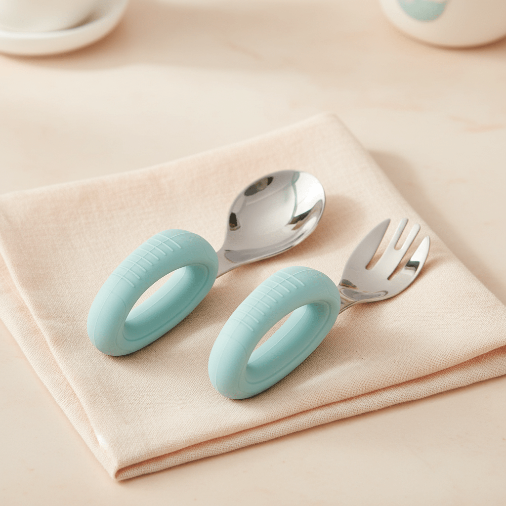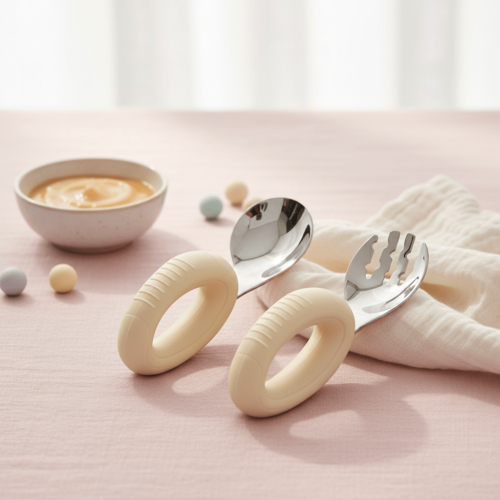 Nos couverts bebe en acier inoxydable avec manche en silicone alimentaire sont spécialement conçus pour accompagner bébé dans ses premières expériences à table. Avec leurs formes arrondies et leur prise en main intuitive, ils transforment chaque repas en moment de découverte sereine.
